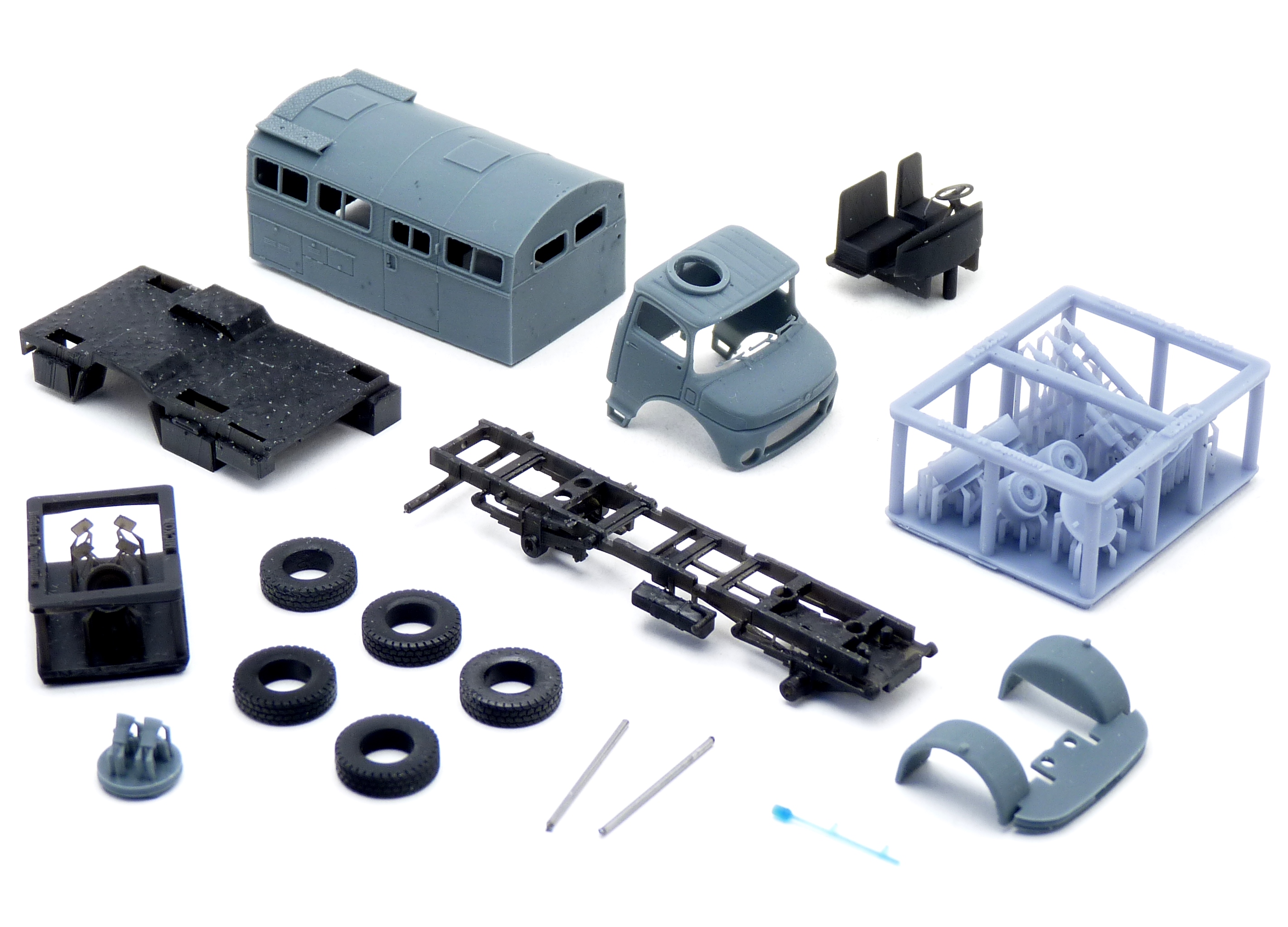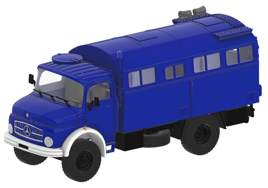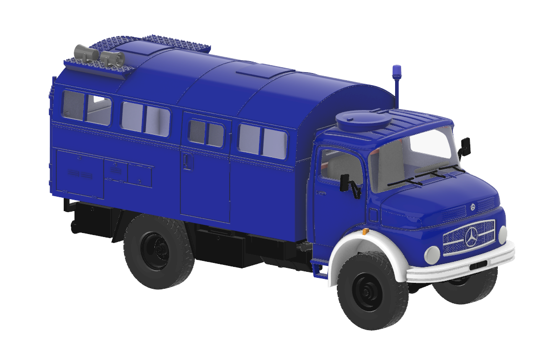 Bausatz eines Mercedes-Benz LA 911 mit Funkkoffer des THW im Maßstab 1:87
